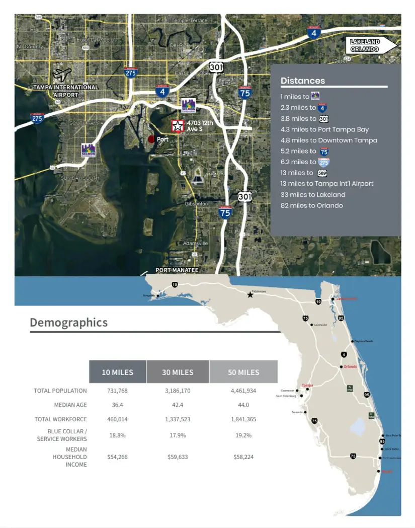 This site has unparalleled connectivity to significant transportation routes and offers seamless logistics and distribution advantages including close proximity to the Port of Tampa Container Terminal and Downtown Tampa.